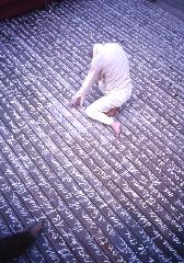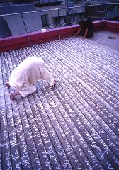 Exhibition of a 6x4 meter calligraphy work, in a long and dark venue at the highest floor (12F) of the Yotsuya-Kumin-Center building in Shinjuku.