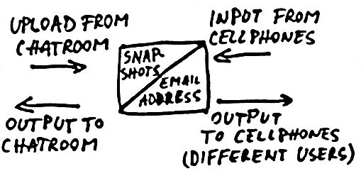 - may wish to provide a PC or phone to let visitors to the exhibition to participate. This PC could also display incoming photos and the chatroom web interface (depending on artistfs decision).