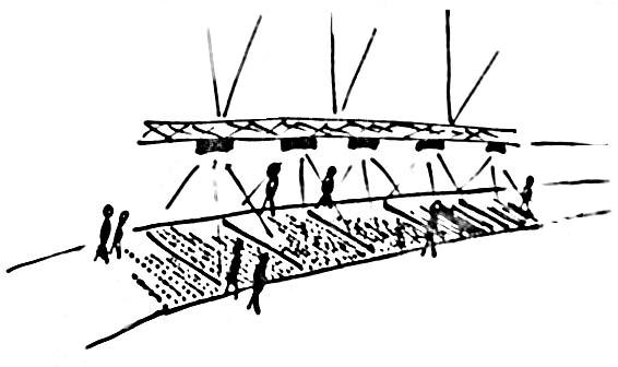 Presentation and navigation software has not yet been decided, although it will leverage linux and is leaning toward a combination of an OpenGL/X-Windows based presentation and lower resolution text terminals. One requirement is the ability to handle different languages. We have considered a low-resolution ANSI telnet terminal for each paving stone (projector) of Tsunawatari, and this is still possible especially if costs are a problem (i.e. several obsolete machines could be used). However this part also may be high resolution so that we can display photographic icons with participant's speech when available. Depending on the exhibition space it may also be cost-effective / interesting from a creative aspect to use a miniature linux box, wireless LAN, and attached projector to create an easily reconfigurable solution to visualizing a portion of the chat stream. In this sense we have been considering experimenting with different topologies for the display network in Tsunawatari.